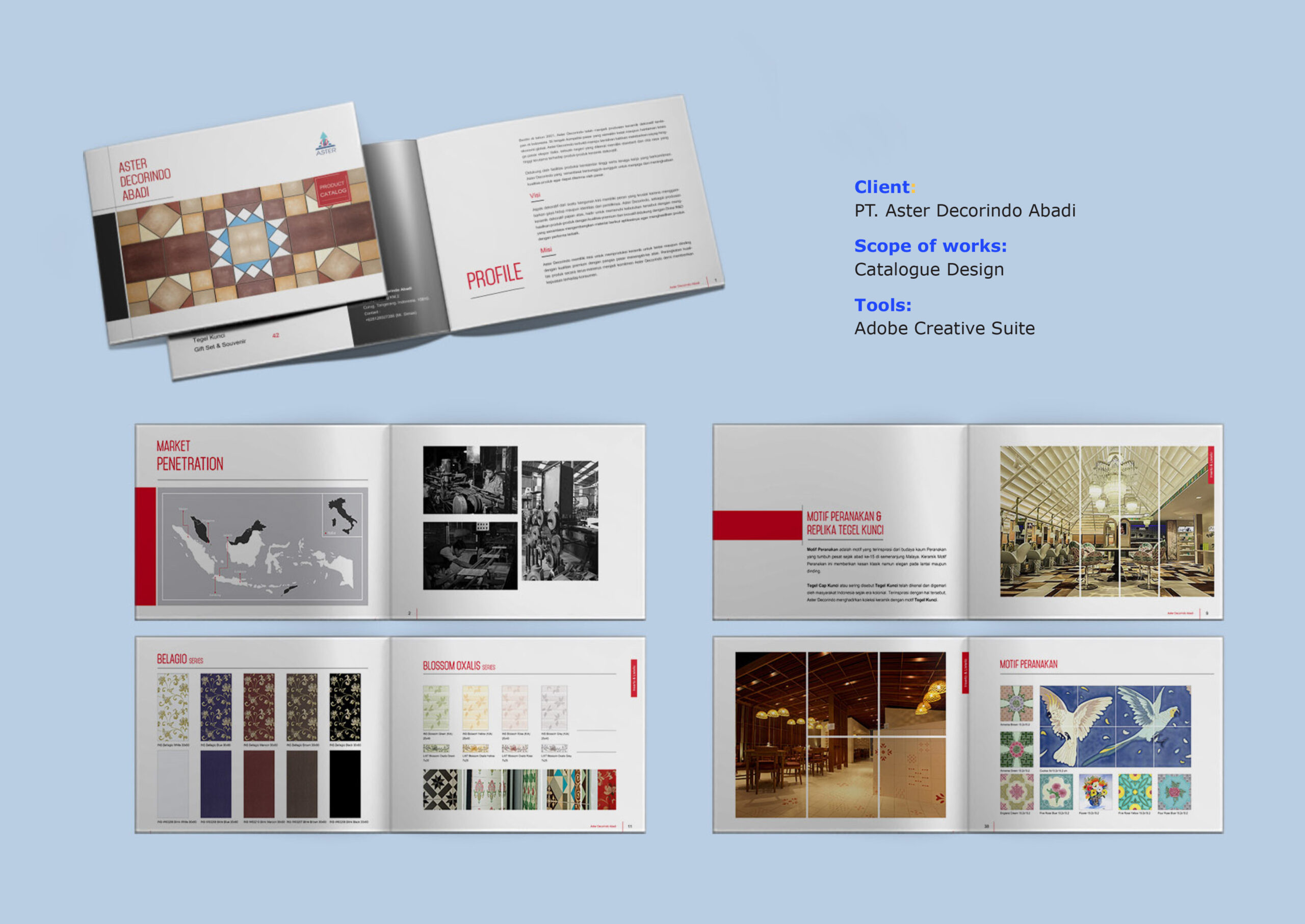 The product catalog became an effective marketing tool for Aster Decorindo Abadi, boosting engagement at trade shows, improving distributor presentations, and supporting sales efforts. The elegant design successfully positioned the brand as a leader in the tile manufacturing industry, helping attract new clients and strengthen relationships with existing partners.
